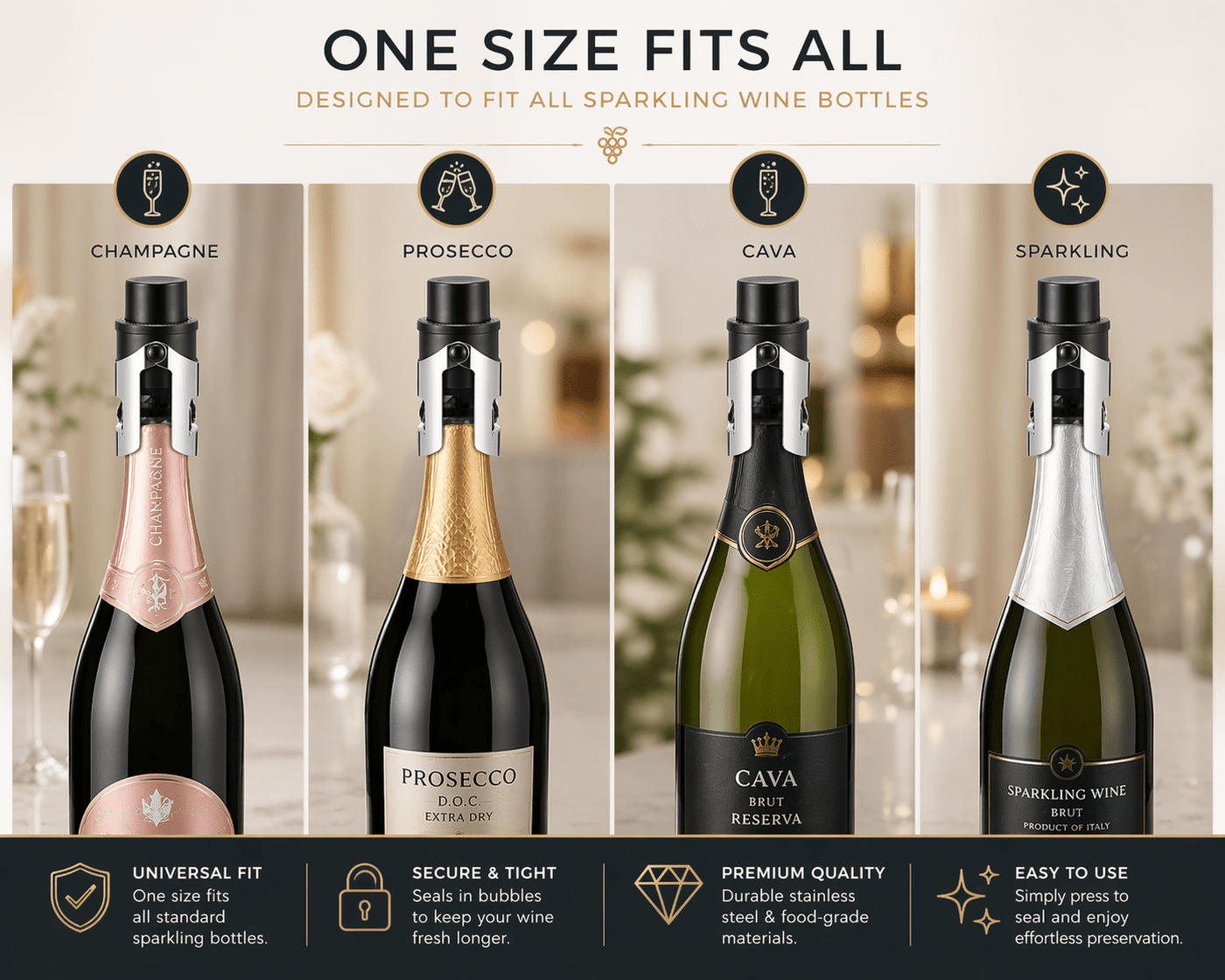Works beautifully on champagne, Prosecco, Cava, and any other standard sparkling wine bottle. No tools needed. No complicated setup. Just the best champagne recorker experience you can get without spending a fortune.